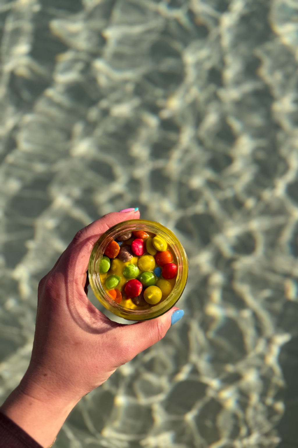 | Složení: | Arašídy loupané pražené (Argantina) 57,93 %, čokoládové dražé 18,18 % (cukr, sušené plnotučné mléko, kakaové máslo, kakaová hmota, syrovátka z mléka, rostlinné tuky (bambucký, palmový olej), škrob, emulgátor: lecitiny, želírující látka: arabská guma, leštící látky: včelí vosk, karnauba vosk, šelak, koncentráty šťáv z: ředkvičky, černého rybízu, citronu, červené řepy, extrakty z: karthamus, ječmenný slad, koncentrát spiruliny, aroma), třtinový cukr, mléko sušené odstředěné, barvivo: kurkumin. Může obsahovat stopy ostatních skořápkových plodů. |